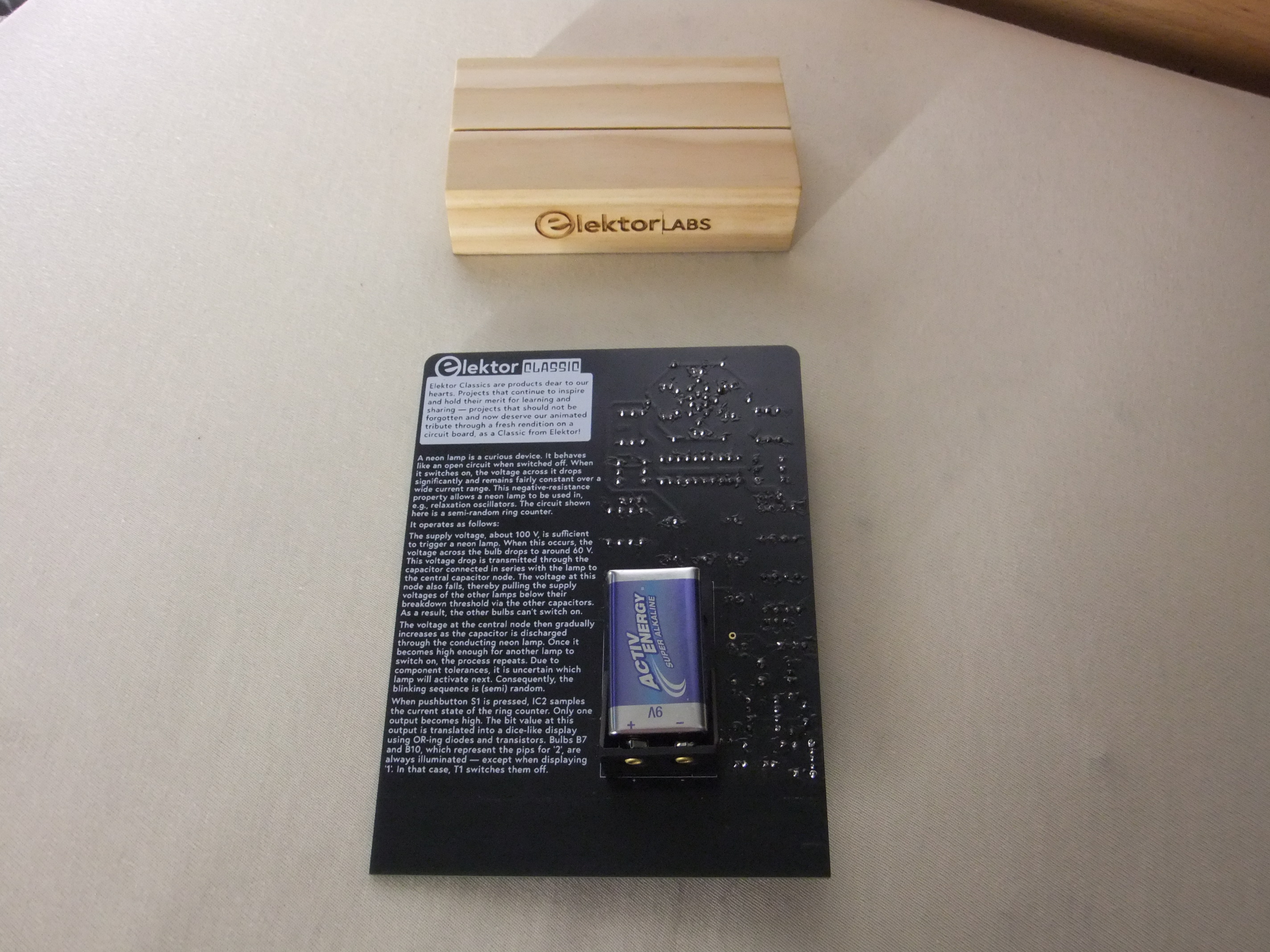 Ein einfacher Bausatz von Elektor, mit Ständer und allen Bauteilen ausser einer 9V-Batterie.